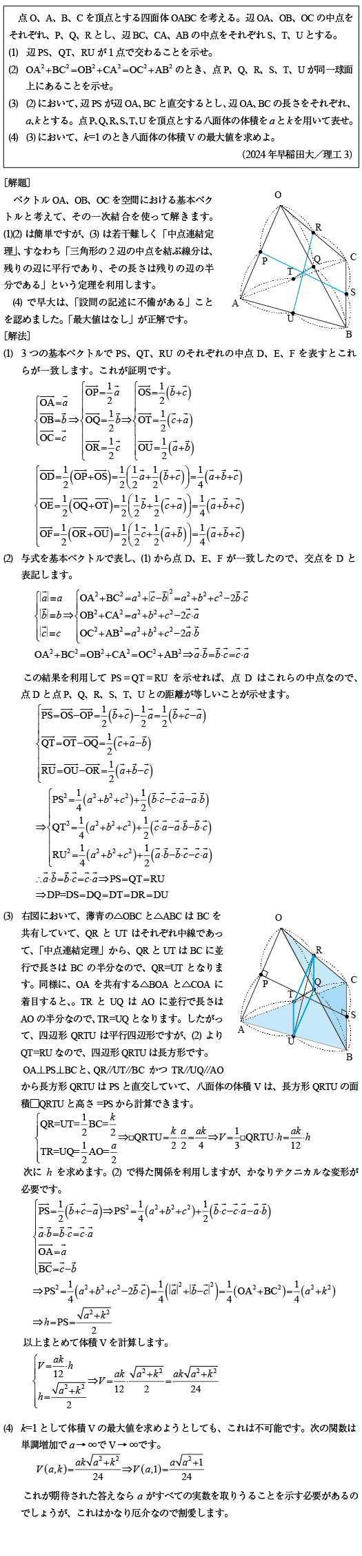 [C]四面体内の八面体の体積の問題(2024年早稲田大/理工3)