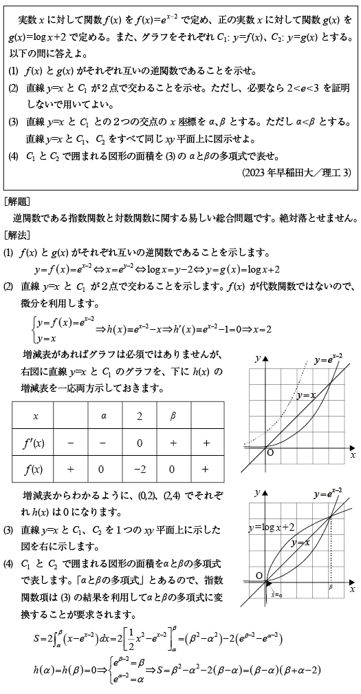 [B]指数・対数関数の逆関数の総合問題(2023年早稲田大/理工3)