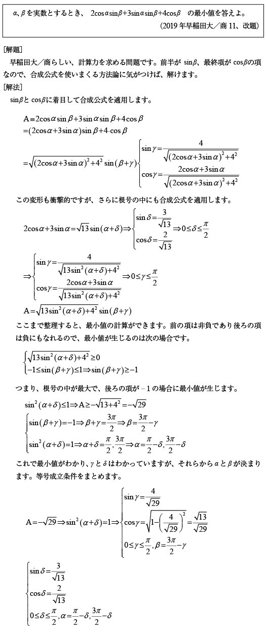 [C]三角関数の合成公式を何度も使う問題(2019年早大/商11)