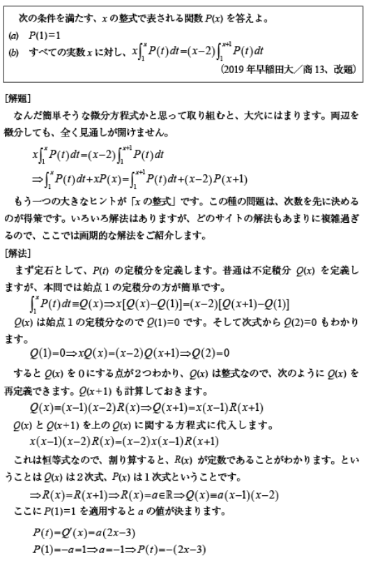[D]整式の積分方程式の問題(2019年早大/商13)