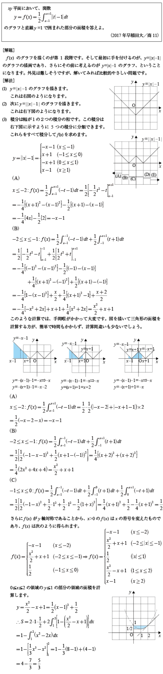 [C]絶対値記号付き積分の問題(2017年早大/商11)