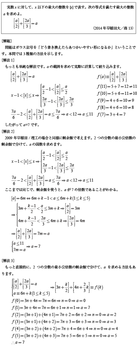 [C]ガウス記号の1次方程式の問題(2014年早大/商13)