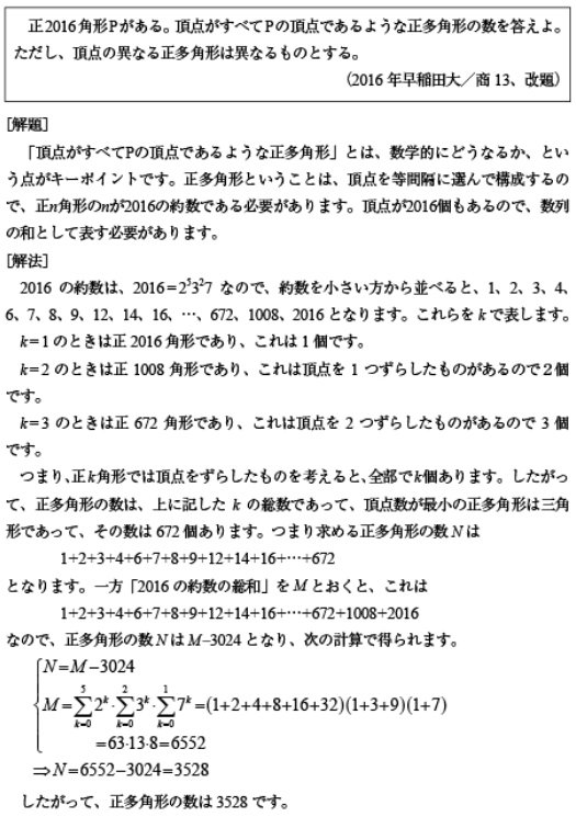 [C]正2016角形の頂点で構成される正多角形の数の問題(2016年早大/商13)