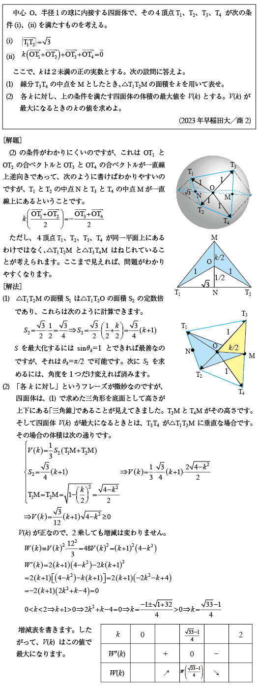 [C]球内接四面体の体積最大化の問題(2023年早大/商2)