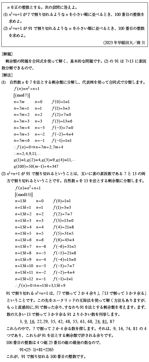 [B]91を法とする剰余類の問題(2023年早大/商3)