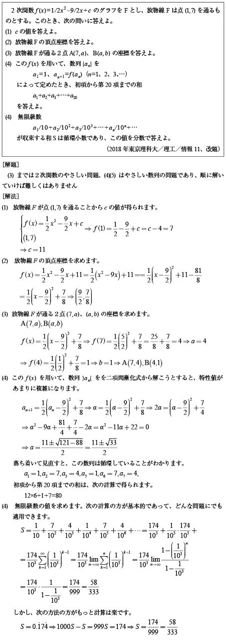 [B]2次関数と数列と循環小数を組み合わせた問題