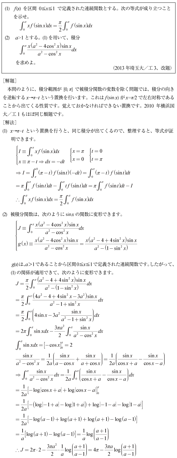[C]積分範囲を反転する置換積分の問題(2013年埼玉大/工3)