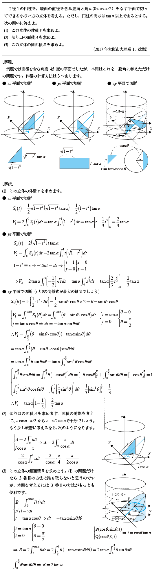 [B]円柱の断片の体積・断面積・速面積の問題(2017年大阪市大理系1)