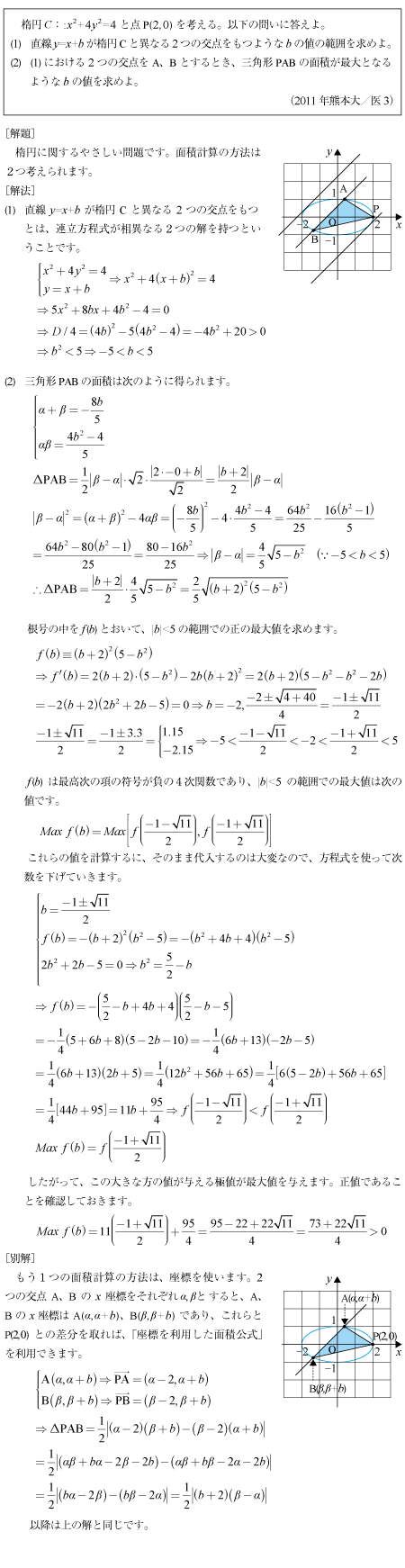 [B]楕円上に頂点を持つ三角形の面積の問題(2011年熊本大/医3)