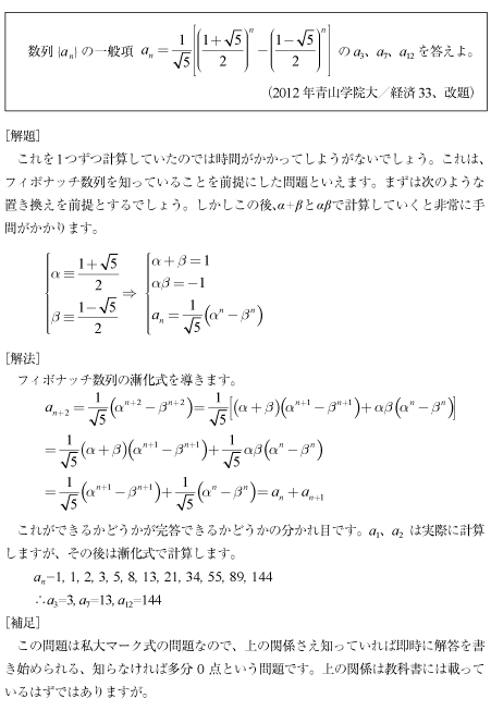 [B]フィボナッチ数列の計算問題(2012年青山学院大/経済33)