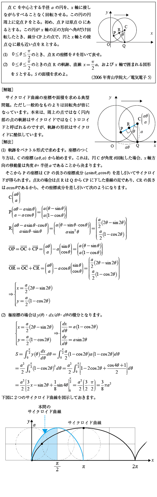 [B]サイクロイドが囲む面積を求める問題(2006年青山学院大/電気電子5)