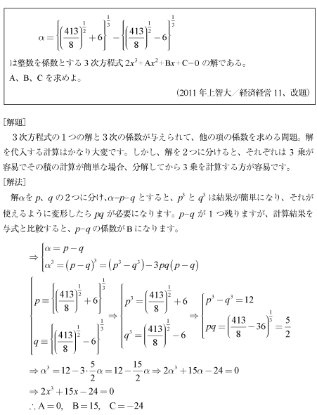 [B]3次方程式の解から係数を求める問題(2011年上智大/経済経営11)