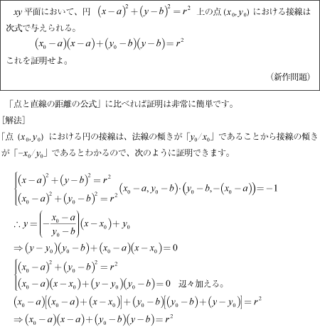 HOME > ◎数学基礎 > 公式証明 > 円の接線の公式疑問点のお問い合わせやご注文などは、■御注文・お問い合わせの手順にしたがってadmin@K-Kyogoku.comへお願いします。最近はかなり頻繁に更新しているので、時々[再読み込み]を行ってください。難関大入試対策「最強の良問集成(2025年版)」提供を開始しました。こちらへ「保護されていない」って出てきたけど,大丈夫? 「保護されていない通信」