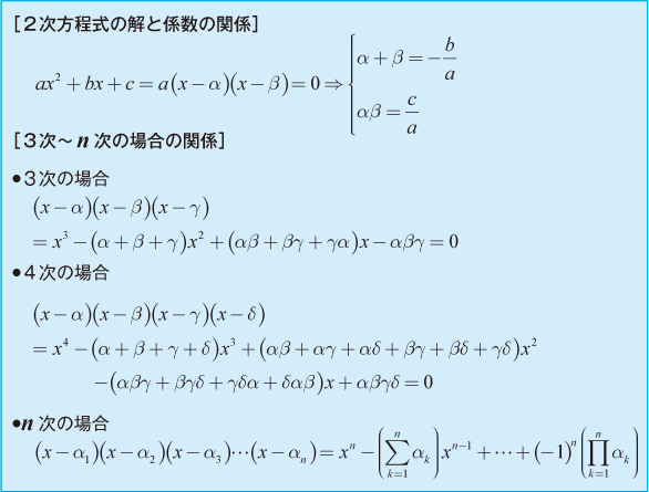 高次方程式の問題では、因数定理を利用してできる限り因数分解するか、因数分解が見込めない場合は解と係数の関係を利用して解きます。例として3次方程式で解説します。