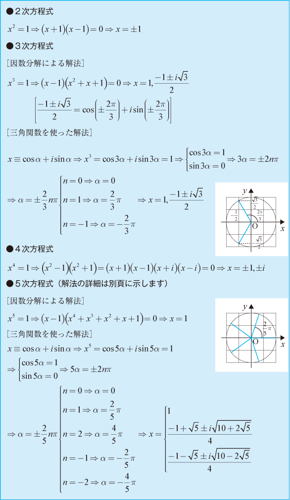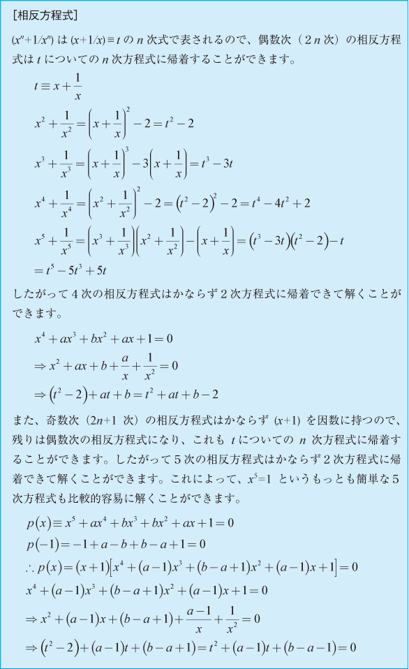 右辺が1の方程式は、2次の場合は因数分解で簡単に解け、4次の場合は2次の場合を拡張して解くことができます。3次や5次の場合はまずx=1が解であり、残る偶数個の解は2つずつ互いに共役複素数になります。そのため、三角関数と複素数の「ド・モアブルの定理」を使ってかならず解くことができますが、多項式のままで解くこともでき、これは「相反方程式」と呼ばれます。