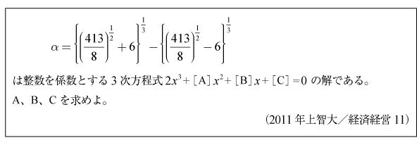 [B]3次方程式の解から係数を求める問題(2011年上智大/経済経営11)
