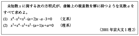 [B]純虚数解をもつ高次方程式の係数決定の問題(2001年京大 文1第2)