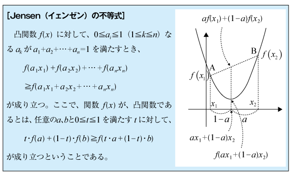 わかってみれば内容は簡単な凸曲線の性質にもとづく不等式です。この不等式の発想を利用すると、むずかしい問題が簡単に解けることがあります。また、n次の相加平均≧相乗平均の証明にも利用できます。