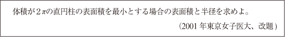[B]体積一定で表面積最小の直円柱の問題(2001年東京女子医大)