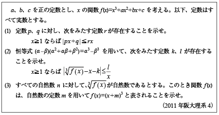 [E]三角不等式などを利用して3次関数の形を決定する問題(2011年阪大理4)