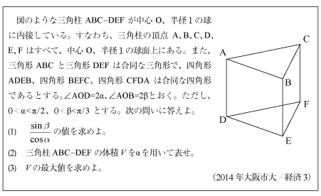 [C]円に内接する正三角柱の最大体積の問題(2014年大阪市大/経済3)