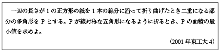 [C]正方形の紙を折り曲げて線対称な五角形をつくる問題(2001年東工大4)