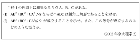 [C]三角形の辺長の2乗和を調べる問題(2002年京大理系2)