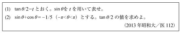 [A]tanθ/2を利用する問題(2013年昭和大/医112)