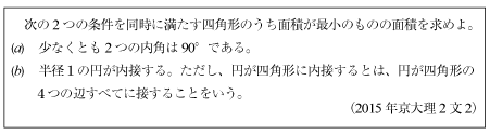 [B]tanと相加平均≧相乗平均を利用する問題(2015年京大文2理2)