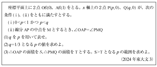 [C]x軸上の2点を見込む角を使った面積の問題(2024年東大文3)