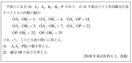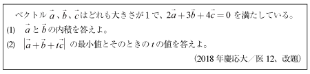[B]ベクトルの内積の計算問題(2018年慶応大/医12)