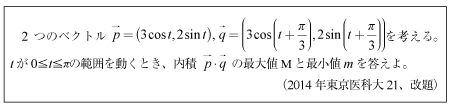 [B]三角関数が成分のベクトルの内積の値域の問題(2014年東京医科大21)