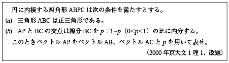 それぞれのメリットを実感するのに最適な入試問題があり、以下に示します。内積はベクトルの初歩のレベルに属しますが、内分点・外分点をあつかうベクトル方程式は若干むずかしいので、[解説]ベクトル方程式を用意しておきます。これは筆者が受験したころは難問あつかいで,余り入試には出題されませんでしたが、最近は超頻出の問題です。