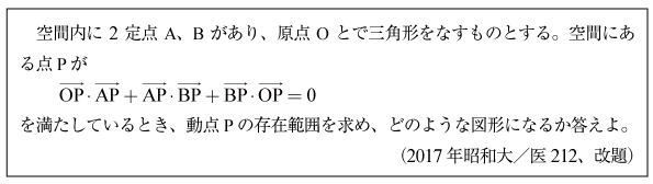 [B]ベクトルの内積で定義した図形の問題(2017年昭和大/医212)