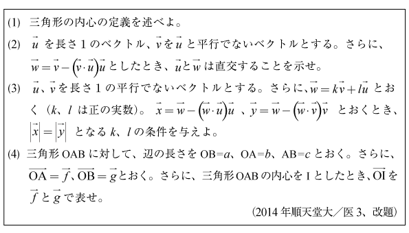 [D]内心とベクトル方程式の問題(2014年順天堂大/医3)