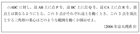 [D]三角形の3辺上に頂点をおく三角形の重心の位置の問題(2006年京大理5)