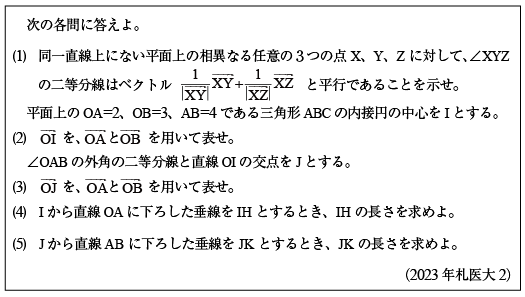 [C]ベクトルで解く三角形の内心と傍心の問題(2023年札幌医大2)