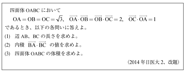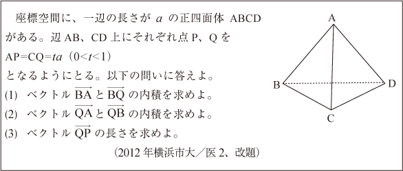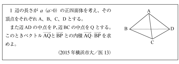 [B]正四面体内のベクトルの内積の問題(2015年横浜市大/医13)