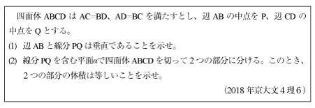 [C]四面体の体積二等分平面の問題(2018年京大文4理6)