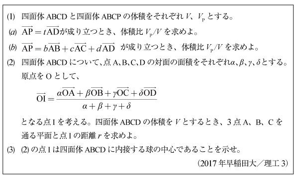 [C]四面体の内接球の半径の問題(2017年早大/理工3)