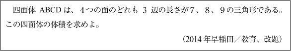 [C]合同三角形が構成する四面体の体積の問題(2014年早稲田大/教育14)