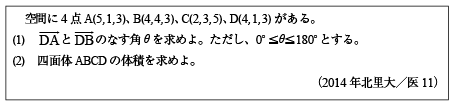 [A]四面体の体積を4つの頂点の座標から計算する問題(2014年北里大/医11)
