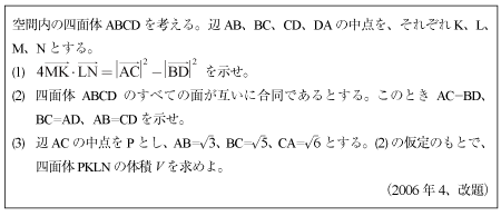 [C]各面が合同な四面体の内部の四面体の体積の問題(2007年東工大4)