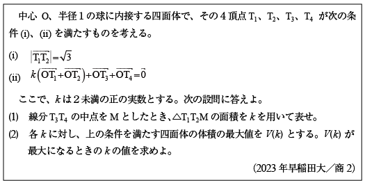 [C]球内接四面体の体積最大化の問題(2023年早大/商2)