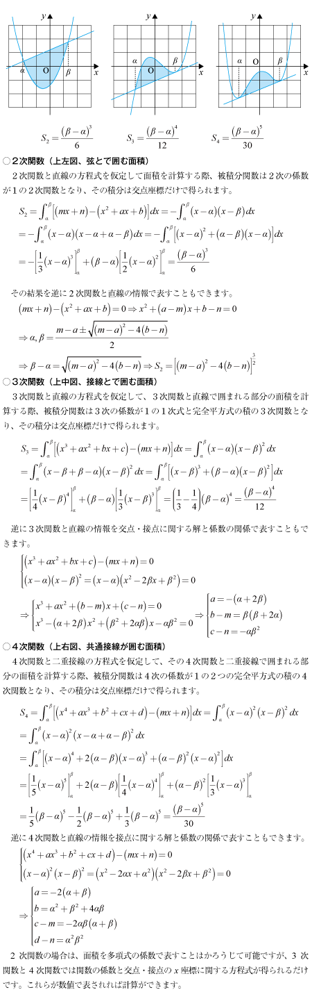 これらの公式は、2次関数と直線の方程式を仮定して面積を計算しますが、被積分関数は2次の係数が1の2次関数に過ぎず、その2次関数積分は交点座標だけで得られます。以下にその詳細を示します。