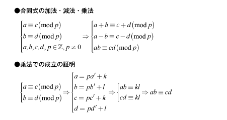 「割れるかどうか」なだ剰余類がよいのですが、「余りはいくらか」という問題においては合同式のほうが便利になります。合同式の場合には、剰余類が加法・減法・乗法において閉じていることを利用します(除法においては閉じていません)。「閉じている」とは、同じ剰余類に属する要素同士の演算の結果が同じ剰余類に属している(外に飛び出さない)ということです。これを合同式の記号で表すと次のようになります。加法・減法の証明はあまりに簡単なので、乗法の場合だけ証明を示しておきます。