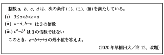 [D]剰余類を利用して4つの自然数を求める問題(2020年早大/商12)