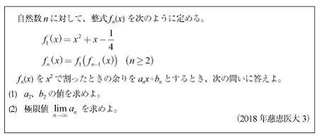 [C]関数漸化式と割り算と極限値の問題(2018年慈恵医大3)