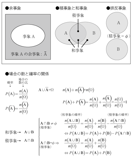 もっとも有用なのが「余事象」という考え方です。たとえば「ある数が5で割り切れる」という事象Aに対し、「ある数が5で割り切れない」という事象Aバー(_A)を「事象Aの余事象」といいます。ある数が「5で割り切れる」ということと「5で割り切れない」ということとは、どちらかが起きて同時には起きない(両立しない)事象であり、このような関係にある事象を「排反事象」とよびます。