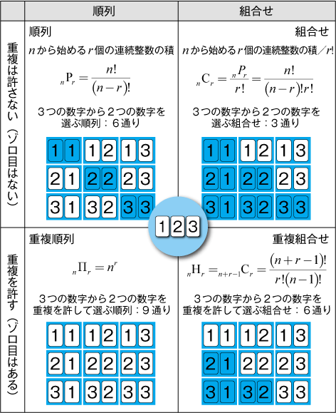 - 重複順列: (1,1), (1,2), (1,3), (2,1), (2,2), (2,3), (3,1), (3,2), (3,3)の9通り